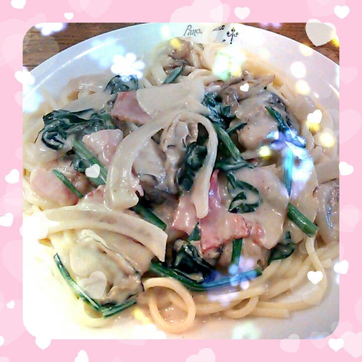 お昼はパンコントマテで、カキのクリームソースのパスタ食べました!